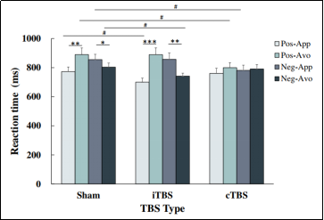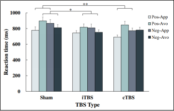 研究结果发现,结果发现左侧DLPFC的兴奋性iTBS增强了自动行为倾向,表现为加快了积极趋近行为和消极回避行为;而抑制性cTBS则消除了自动行为倾向,表现为积极图片的趋近和回避行为差异消失,消极图片的趋近和回避行为差异消失(图1)。但右侧DLPFC刺激并未直接调节个体的趋利避害相容效应(图2)。