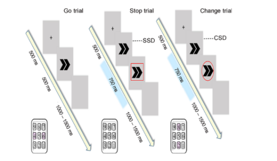图1 三种试验类型的图解:GO(左)、Stop(中)和Change(右)。CST=改变信号任务;CSD=改变信号延迟;SSD=停止信号延迟;SST=停止信号任务。