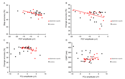 本研究共19名羽毛球运动员和20名非运动员完成了停止信号任务和改变信号任务。记录并分析反应时和事件相关电位。