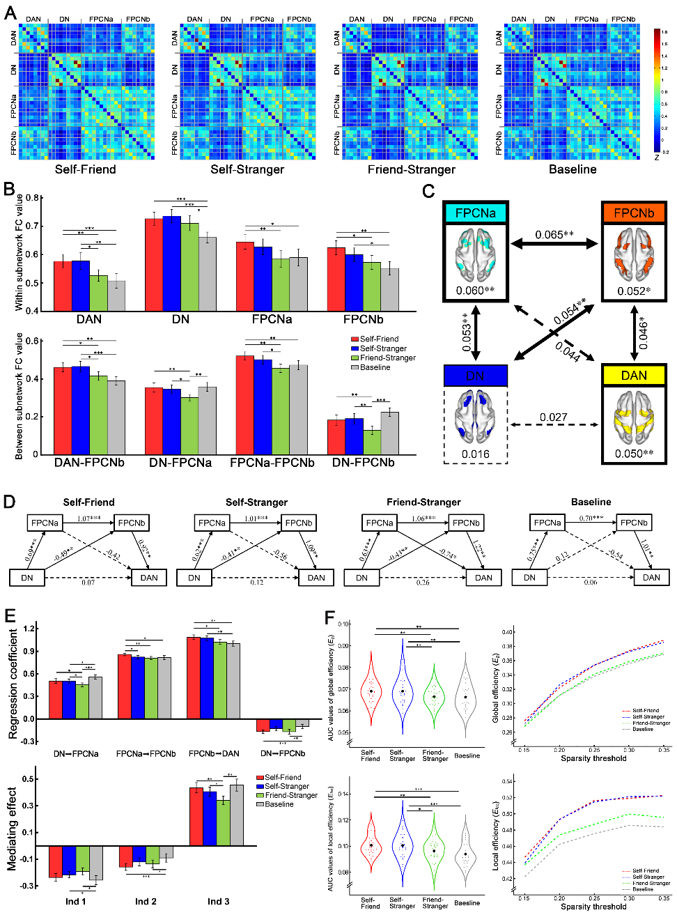 图1.主要结果。(A)各条件下的功能连接矩阵;(B)网络间和网络内部的功能连接值在条件间的比较;(C)网络水平上Self‒Friend和Friend‒Stranger间的差异;(D)各条件下的链式中介模型;(E)中介分析回归系数和调节效应在条件间的比较;(F)网络整合和分割程度在条件间的比较。