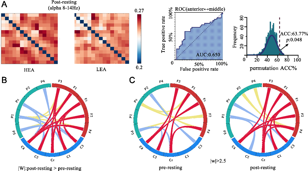 2)此外,静息态前额区alpha与中央区alpha之间的功能连接(phaselagindex,PLI)同样可以显著区分实验组与对照组被试(图2)。已有研究发现前额-顶叶网络参与几何类比问题解决(Preusse et al., 2011)。而且,-额整合理论(P-FIT)也强调顶叶和额叶区域的协作在流体智力中的重要性(Jung & Haier, 2007)。这进一步支持执行注意训练加强前额与顶叶同步性是后续类比推理表现提升的潜在机制。