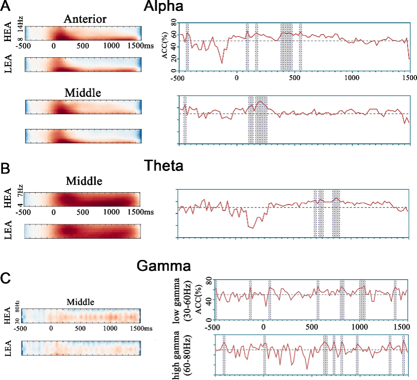 3)当被试在训练后完成类比推理任务时,alpha、theta和gamma活动均可显著区分实验组与对照组被试,此外它们的出现具有一定的时间顺序(先alpha,再thetagamma;图3)。类比推理任务较为复杂,包括任务相关信息,任务无关信息(干扰信息)等多种交错出现,从混乱中脱离出来找到正确信息(任务相关信息)的能力至关重要(Burgoyne & Engle, 2020)。因此,涉及注意分离的alpha活动首先被影响。之后,正确的信息将被保持并进入关系整合阶段,这是类比推理加工中另一个关键操作(Cho et al.,2010)。相应地,涉及信息维持的theta活动和涉及信息整合的gamma活动在第二阶段被影响