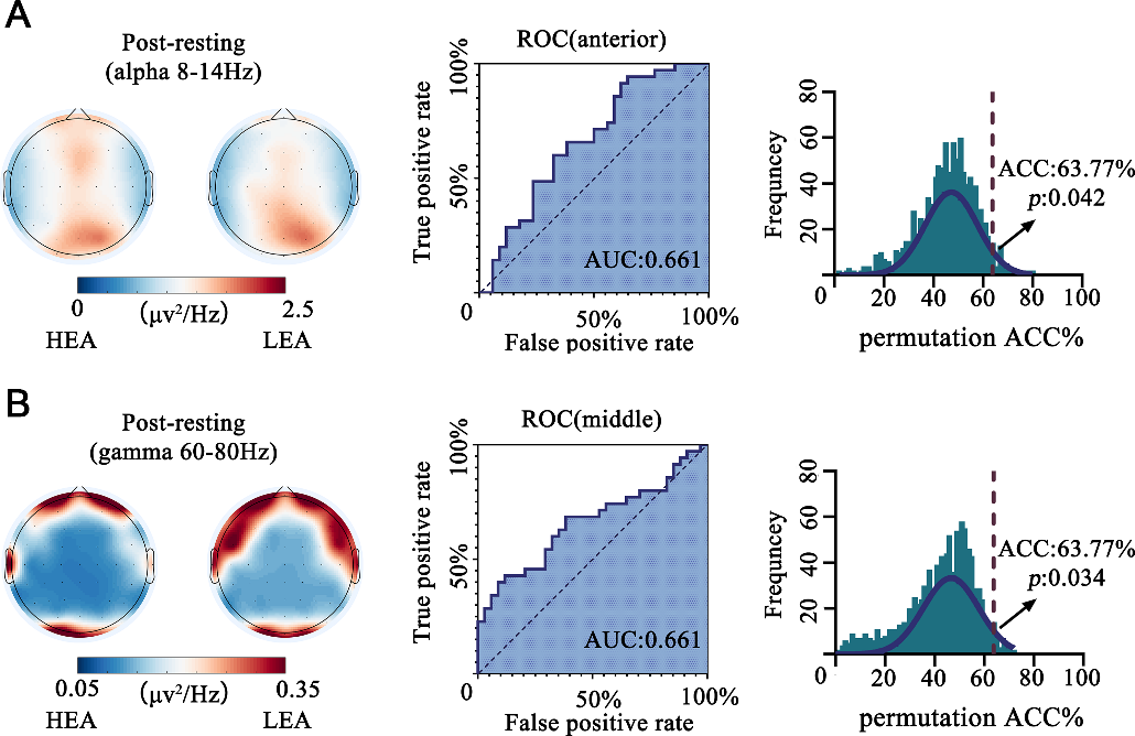 1)在接受执行注意训练之后,静息态前额区alpha以及中央区高频gamma功率谱密度均可显著区分实验组与对照组(图1)。已有研究一致地发现注意相关的训练会改变alpha活动(Knowles & Wells, 2018; Lomas et al., 2015),这提示alpha活动变化是考察执行注意训练有效性的一般性指标。高频gamma活动与空间注意有关(Wyart & Tallon-Baudry, 2008),考虑到本研究所采用的反眼跳训练需要被试进行空间(左右侧)注意转移,这提示高频gamma活动变化是考察执行注意训练有效性的任务特异性指标。