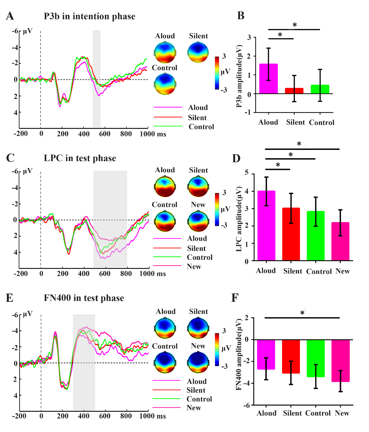 图2.事件相关电位结果。A: P3b(准备阶段)的波幅和地形图。B:P3b波幅的柱状图。C: FN400(测试阶段)的波幅和地形图。D: FN400波幅的柱状图。E: LPC(测试阶段)的波幅和地形图。F: LPC波幅的柱状图。A, C, E:阴影区域表示定义的时间窗口。B, D, F:误差条表示每个平均值的标准误差。*p< 0.05。
