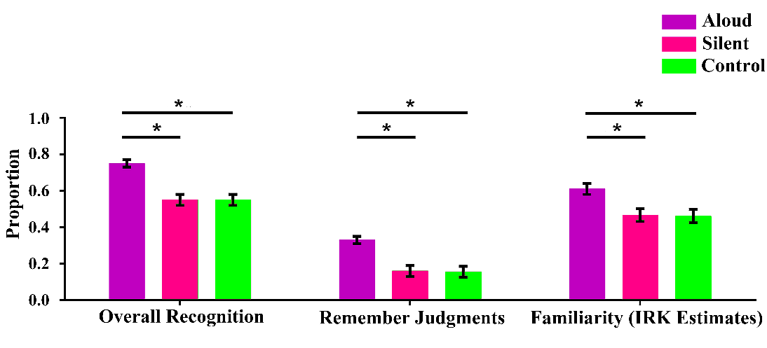 朗读的记忆比默读好,这种记忆优势被命名为“Production effect”(生产效应)。但是生产效应的机制仍然存在争议,研究者通常争论生产效应是区分性(distinctiveness)还是强度(strength)的结果。区分性与记忆中的“回忆”成分一致,强度与记忆中的“熟悉”成分一致为了解决这一争论,本研究使用被试内的Remember/Know判断任务,使用“记得”(Remember)反应来代表“回忆”成分,使用矫正后的“熟悉度”正确率代表熟悉成分[=Know/(1-Remember)],并设置了三个实验条件(朗读条件、默读条件、“检查”条件)。被试需要在朗读条件下朗读词汇,在默读条件下默读词汇,在“检查”条件下不管遇到什么词汇都说“检查”。研究记录了被试在准备加工阶段的大脑反应(脑电数据),以及提取阶段的行为表现和大脑反应,使用LPC成分(LPC old/new effect)来代表“回忆”成分(反映区分性),而使用FN400成分(FN400 old/new effect)代表“熟悉”成分(反映强度),通过运用前沿的脑电分析技术从多个角度揭示了生产效应的心理机制。主要结果介绍如下。