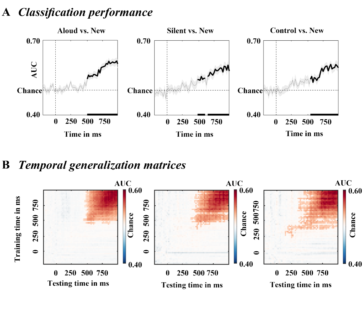 图3.正确再认词汇与正确拒绝词汇的分类结果。A;正确再认词汇与正确拒绝词汇的解码结果,灰线表示分类的准确率。B:时间泛化矩阵,深色表示显著的部分。