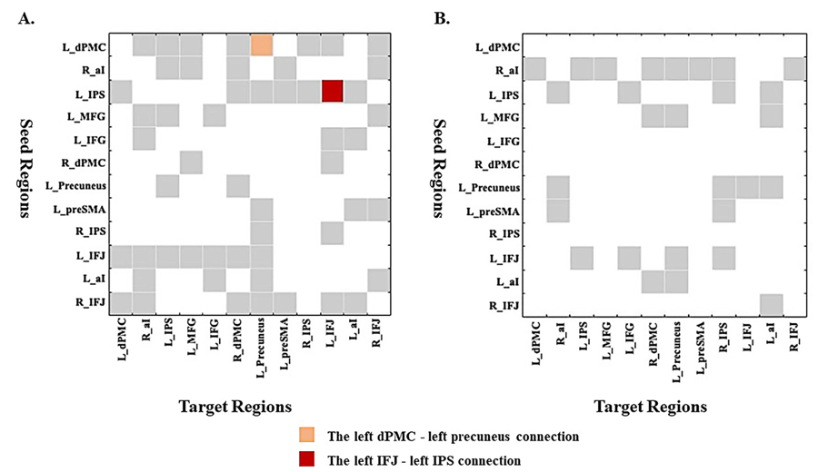 图1.分类支持向量模型的共识特征。连接矩阵中灰色部分代表建立分类模型过程中获得的共识特征。A. 54条整体水平共识特征其中,老年人左背侧前运动皮层-左楔前叶连接明显弱于年轻人。在老年人中,左侧额下联合-左侧顶内沟连接与整体转换代价呈负相关。B. 28条局部水平共识特征。老年人和年轻人之间没有差异显著的特定连接,也没有与局部转换代价显著相关的连接。