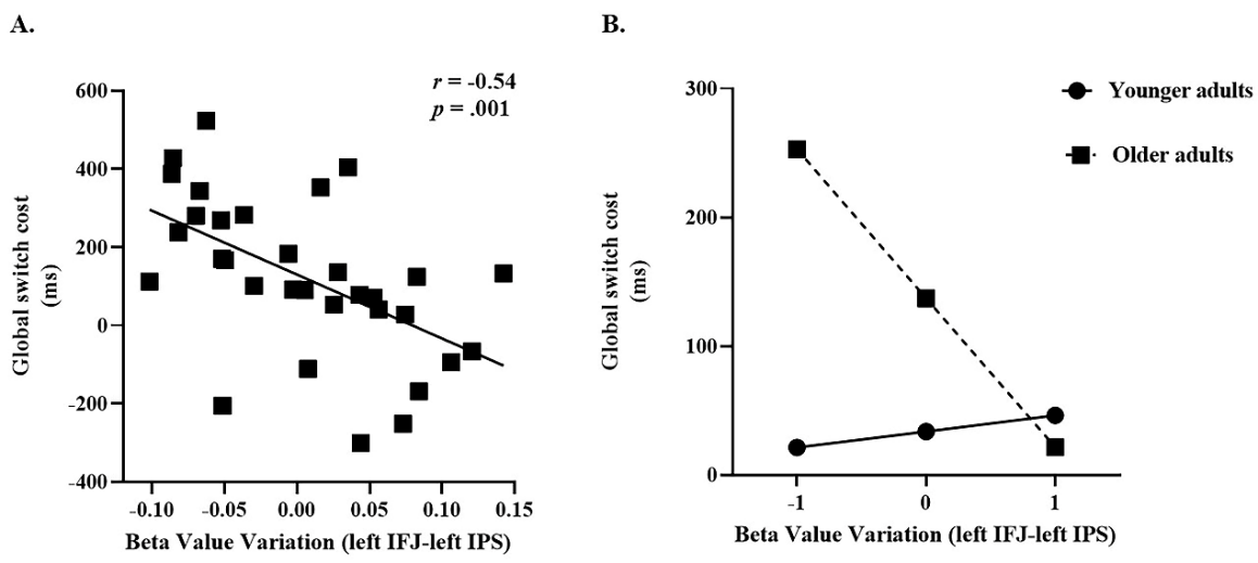 图2.预测模型中共识特征与行为表现之间的关系。A.老年组散点图:左额下联合-左顶内沟连接与整体转换代价显著负相关。B.调节效应分析。左额下联合-左顶内沟连接与整体转换代价的关系在年轻组和老年组之间存在显著差异。
