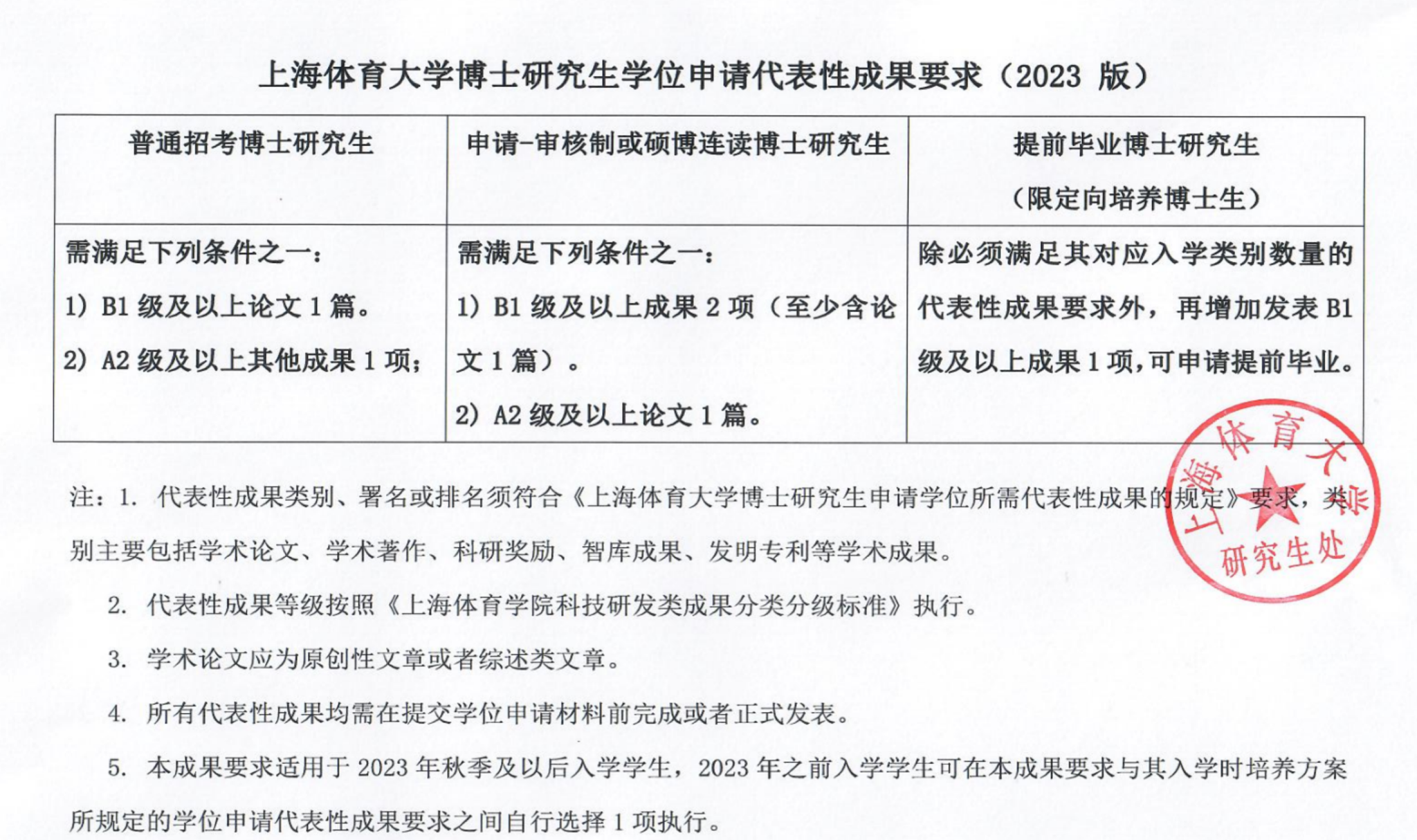 6.学术交流与成果:(1)研究生在读期间至少应选听10场(次)与所学学科专业相关的学术报告,并做好听讲记录和撰写心得体会,每位博士在预答辩之前至少进行3次公开的论文阶段成果报告会,完成后获得相应学分。(2)为加强体育科学研究意识,提高科学研究能力,博士生在学期间,应按照不同二级学科要求取得对应高水平成果方可进行学位申请(具体成果要求见附件1)。