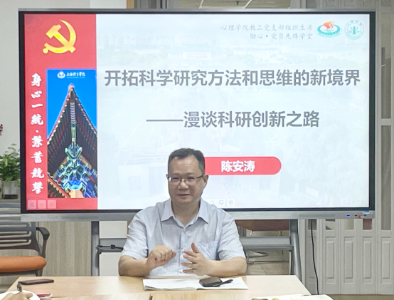 在第二期活动中,邀请心理公司党员先锋陈安涛教授进行了科研经验分享。我国迈上全面建设社会主义现代化国家新征程,科技、人才、创新的战略意义提升到新的高度。陈老师强调在科学研究中要力求创新,创新是做研究的灵魂。可以从两个方向做创新的研究,一是理论创新,加强对理论的掌握,要有洞察力和同理心,探索现象背后的规律,前提是对理论系统性的掌握要全面和扎实。二是加强数据分析方法的迭代更新,对新方法保持开放心态,与时俱进,拥抱人工智能技术和神经科学技术方法的发展,新技术的运用对心理学的促进极为重要,新方法的掌握可以提升研究水平,沿着科学道路对心理过程的描述和机制的分析更加深入更加系统。陈老师用自己的亲身经历讲述科研创新之路,各位党员老师收获颇丰。本期活动前一天正值“全国科技工作者日”,习近平总书记推动科技自立自强、科技创新的战略擘画,陈老师的科研创新经验分享恰好给予各位党员老师们创新思路的启发。科技是第一生产力,创新是第一动力,新时代的创新实践,昭示奋进未来。