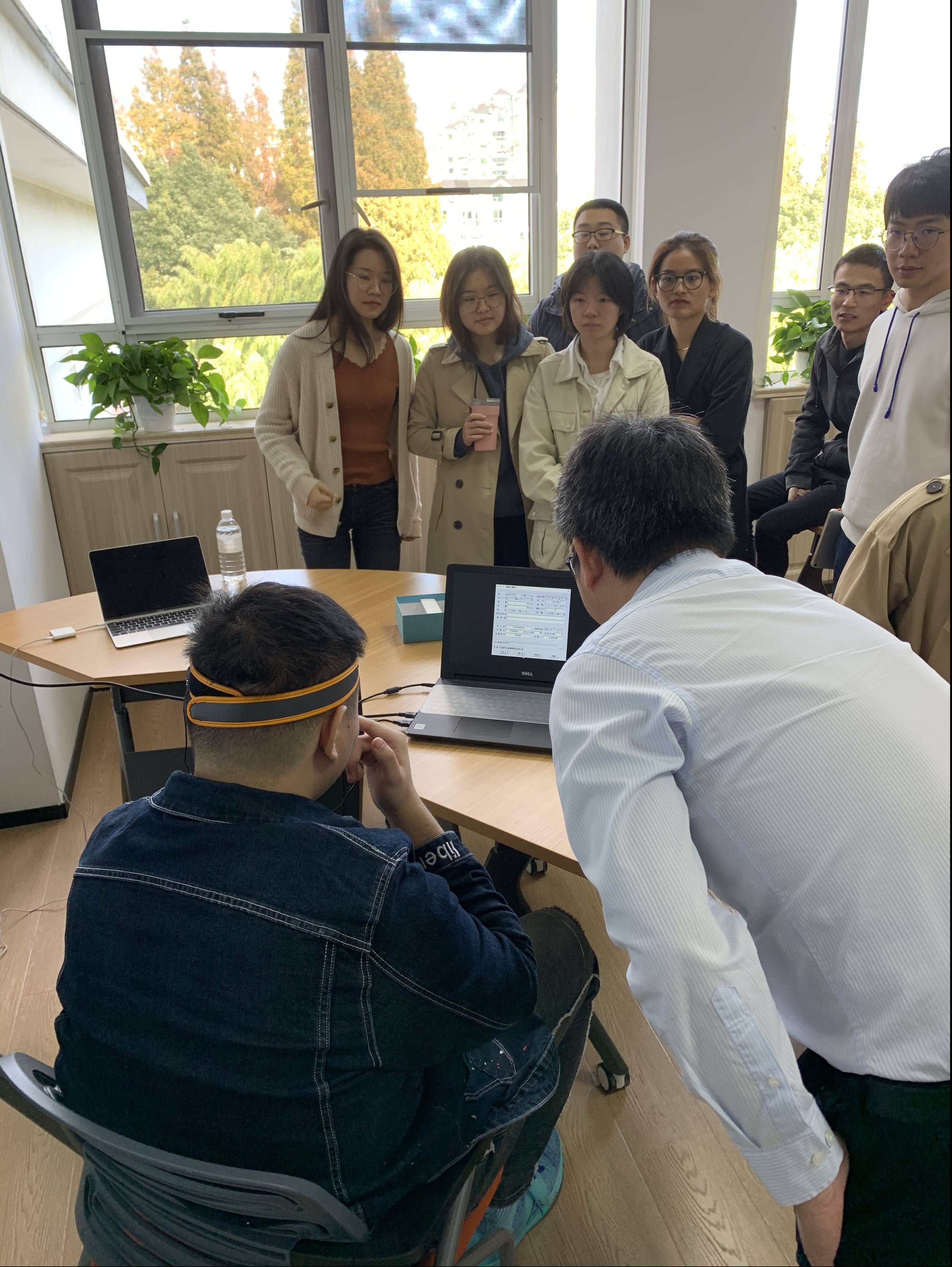 ▲员工透过实际的神经反馈训练,体验以人机互动控制脑电的过程。