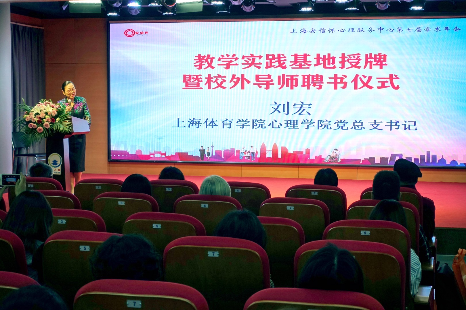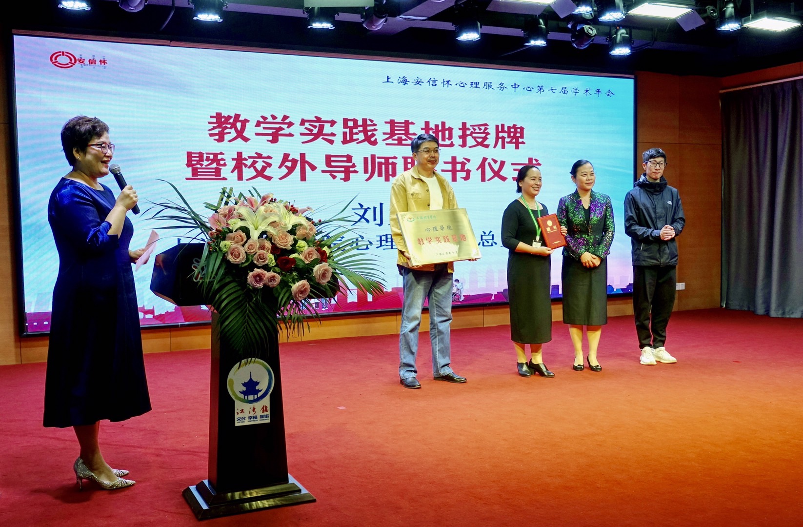 上海体育公司心理公司党总支书记刘宏为安信怀心理服务中心授牌,并为理事长周祝慧颁发校外导师聘书。