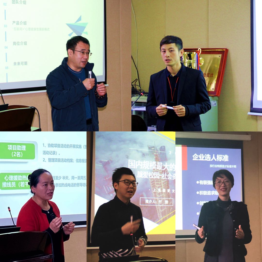 宣讲会上,各企业代表为毕业生详细介绍了公司发展情况、招聘条件以及行业人才需求状况。上海胧爱文化传播有限公司联合创始人付勃先生,通过公司深度融合沪上高校大型文化活动的文图介绍展示,欢迎青年学子来胧爱——未来事业发展的孵化器就业”。安信怀心理服务中心是一家注册在虹口区民政局的3A级社会服务机构,董事长周祝慧女士结合服务妇联、团委、社区、公司的多个案例,为毕业生提供就业实习岗位和推荐机会。作为公司教学实践基地,大型国有企业上海久事智慧体育有限公司战略投资部经理王法先生,分享了运动心理学在足球项目中的应用,欢迎和鼓励毕业生加入到智慧足球系统平台计划中。作为国内第一家心理学行业上市公司,北辰软件股份有限公司总经理杨朝辉先生在介绍互联网+心理学的企业优势之后,还结合多年职场感受,从一般技能、专业技能及工作态度上,给予求职者以中肯的建议。民族美妆品牌伽蓝(集团)春夏培训总监李陈艳女士以“初入职场的友好”为主题,与毕业生分享和互动了企业选人用人的标准,介绍了伽蓝管培生培训方案,以及招聘面试技巧等实战的求职经验。
