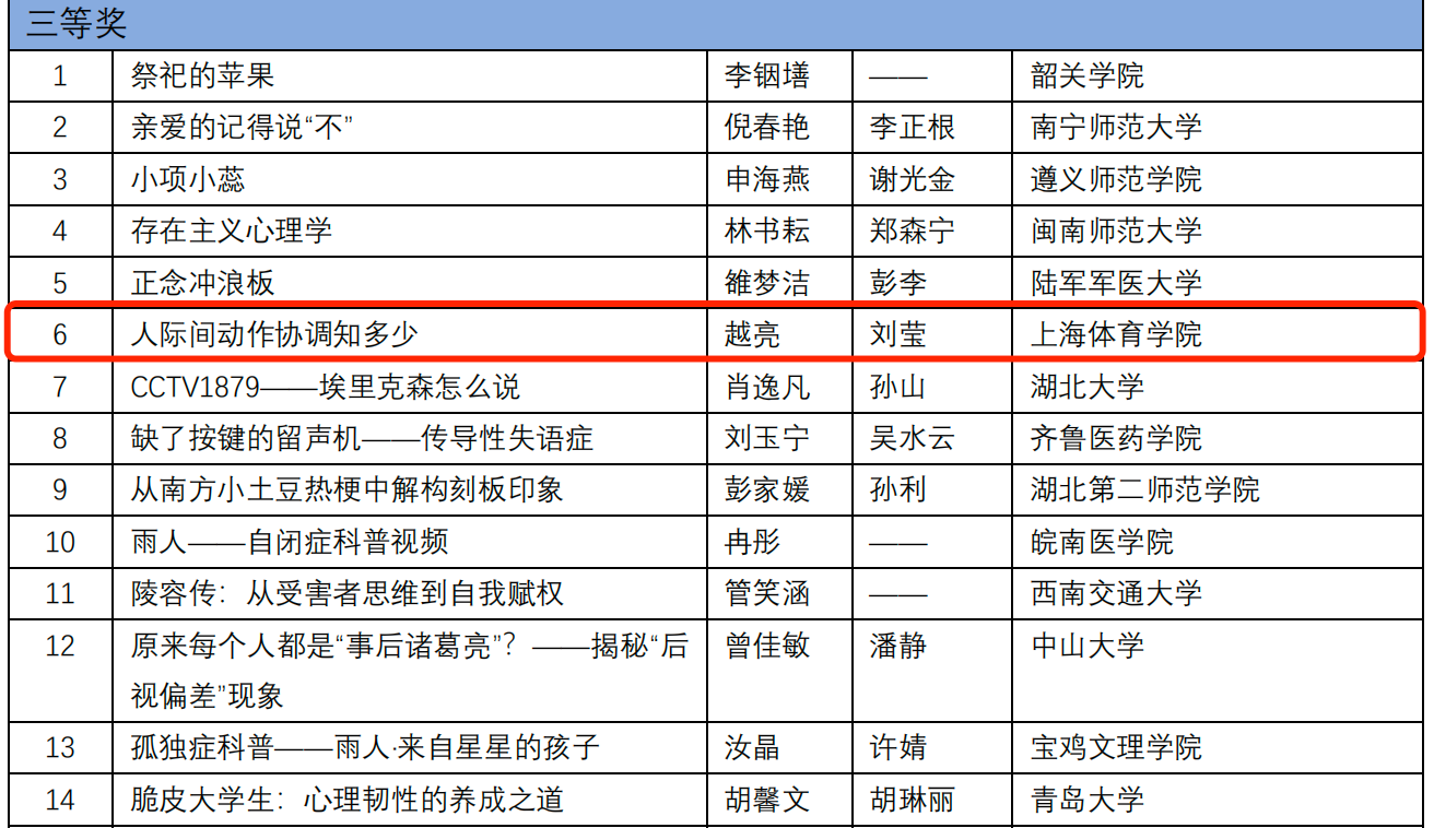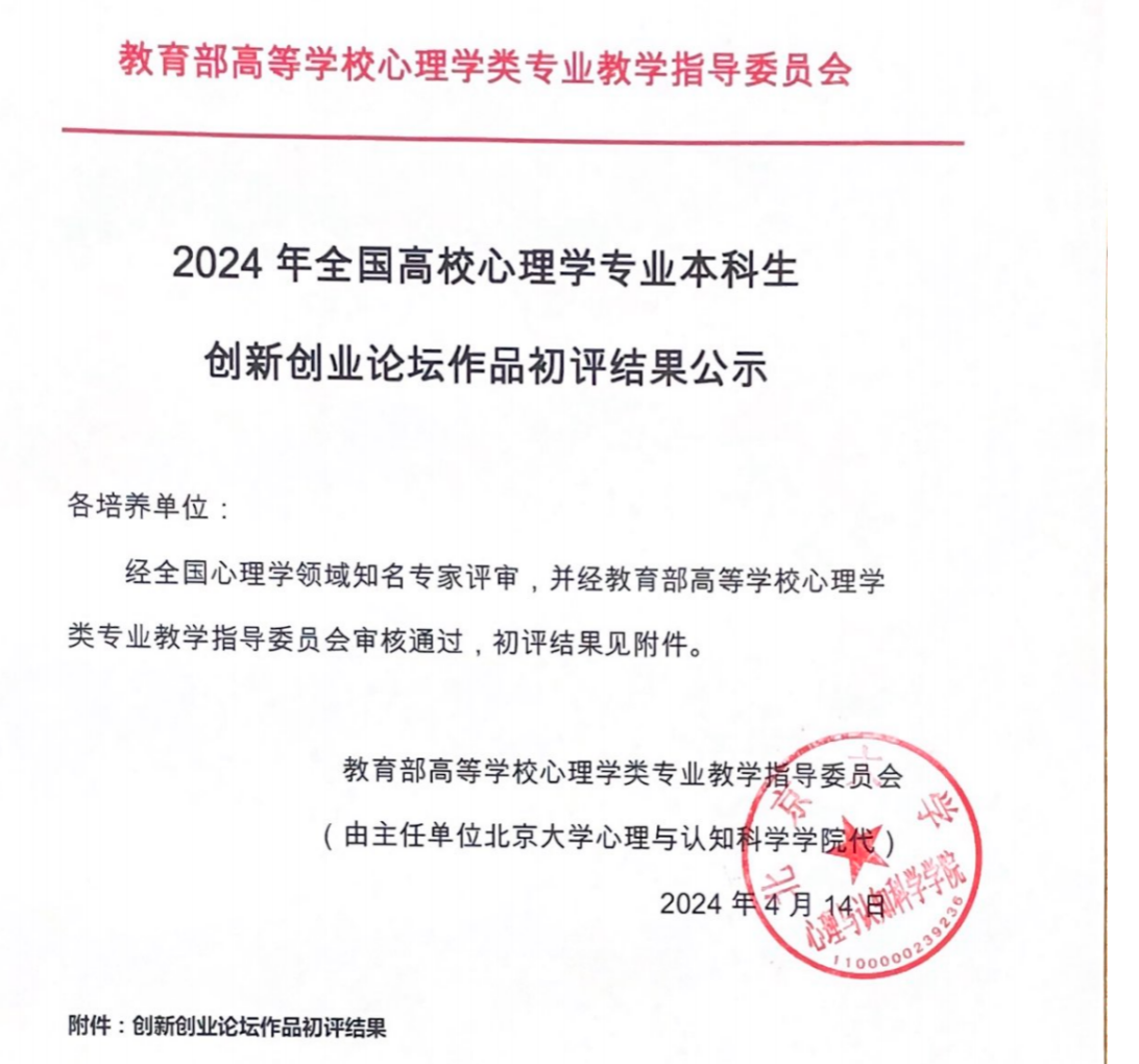2024年4月15日,由教育部高等公司心理学类专业教学指导委员会主办的2024年的全国高校心理学专业本科生创新创业论坛发布了第二轮评审结果。此次论坛涵盖心理实验设计、现实问题解决、心理学产品设计、心理科普短视频四个分论坛,公司何伊宸同学的作品《老员工考研焦虑缓解方案》荣获“现实问题解决分论坛”三等奖,由刘莹老师所指导的越亮小组的作品《人际间动作协调知多少》荣获“心理科普短视频分论坛”三等奖。