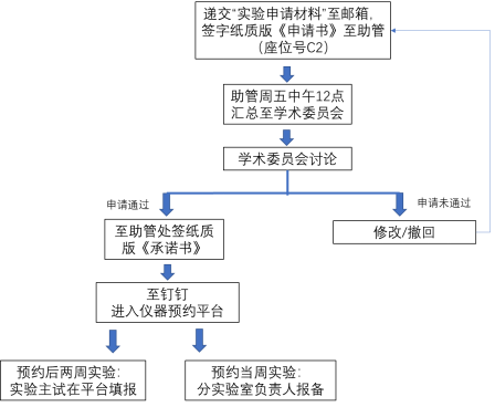 1、实验申请流程(此流程适用于磁共振以外实验的申请):提交“实验申请材料”,发送电子版到sus_psy@163.com,同时将纸质签字版《申请表》(附件1)交到助管(座位号C2)等待评审结果;收到评审通过的通知邮件后,按要求在纸质《实验仪器及实验室使用承诺书》(附件2)上签字并提交;至钉钉实验室群预约平台预约仪器设备,按预约开展实验。