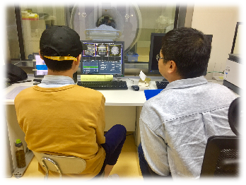 ▲胡杨博士(远)与研究助理唐炎程(近)在脑成像中心实验室进行程序调试。