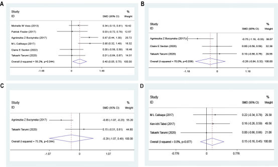 图3.荟萃分析结果。A,锻炼干预对老年人白质中分数各向异性(Fractional Anisotropy, FA)影响的荟萃分析结果;B,锻炼干预对老年人白质中径向扩散(Radial Diffusion, RD)影响的荟萃分析结果;C,锻炼干预对老年人白质中平均扩散(Mean Diffusion, MD)影响的荟萃分析结果;D,锻炼干预对老年人白质体积(White Matter Volume, WMV)影响的荟萃分析结果。此外,文章还讨论了锻炼对老年人海马体积、执行功能、记忆及处理速度的影响在内的荟萃分析结果。注:权重来自随机效应分析。